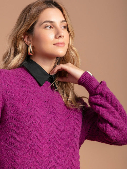 Blusa com tecimento em tranças, gola redonda e mangas de cava quadrada Biamar