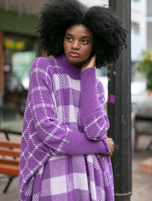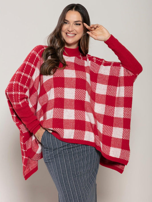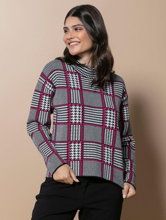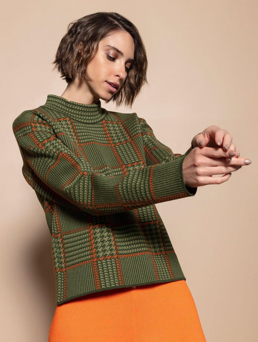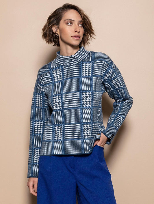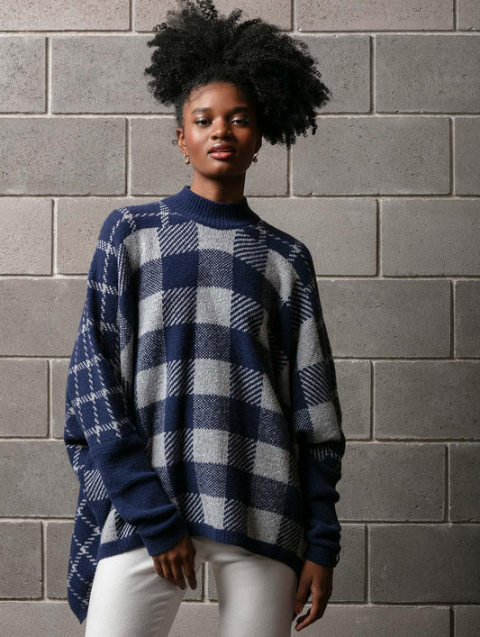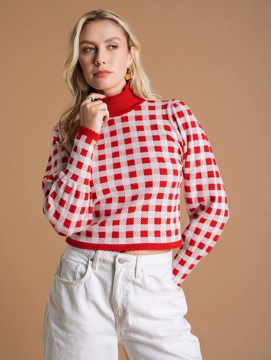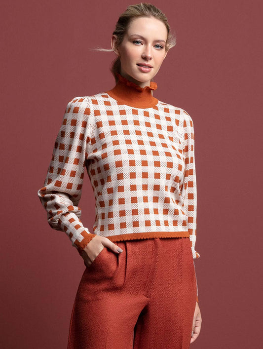 BLUSA EM PADRONAGEM XADREZ COM GOLA ALTA, BABADOS E MANGAS BUFANTES DE CAVA POSTA URBANITY 10587