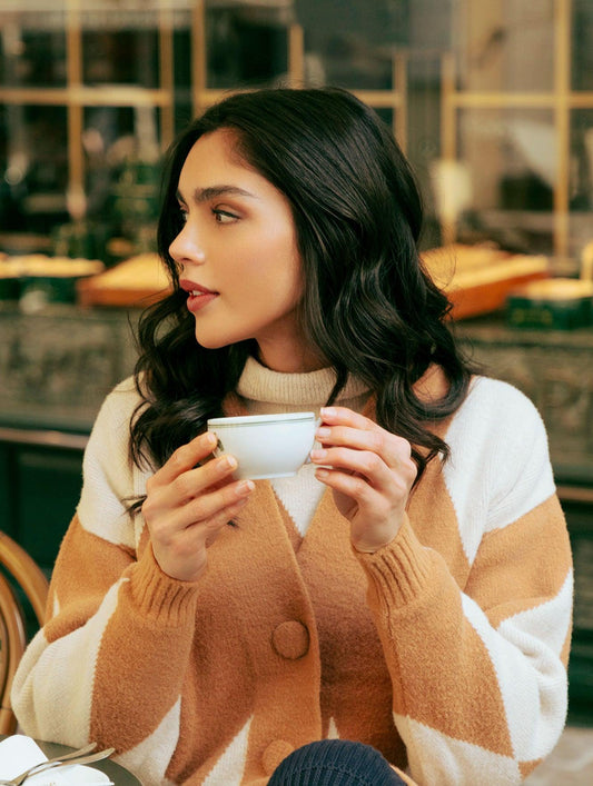 CASACO LONGO EM PADRONAGEM GEOMÉTRICA COM BOTÕES, BOLSOS E MANGAS DE CAVA QUADRADA BIAMAR 11777